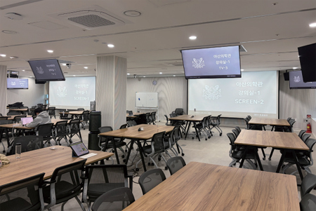 LCME 교육과정이 시작되면서 TBL 수업이 많아졌기에 조별로 나눠서 자리가 배치된 최신식 강의실이다. LCME 교육과정에서의 수업은 동영상 강의를 통해 정보 습득을 하고 수업 시간에는 지식의 응용을 하는 구조로 이루어지기 때문에 이런 좋은 강의실은 학습에 큰 도움이 된다.